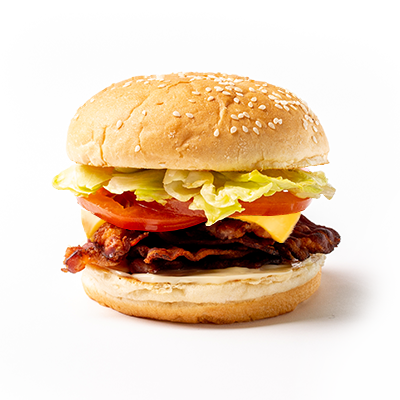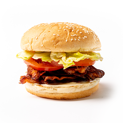 Strips of crispy apple-wood smoked bacon, fresh tomato slices, mayo and hand-shredded lettuce on a soft, toasted sesame seed bun.