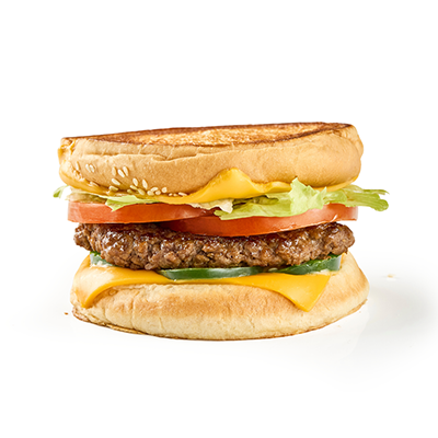 A burger patty in between slices of American-style cheese melted on an inside-out sesame seed bun and grilled until golden brown. Toppings of your choice and bacon can be added as well.