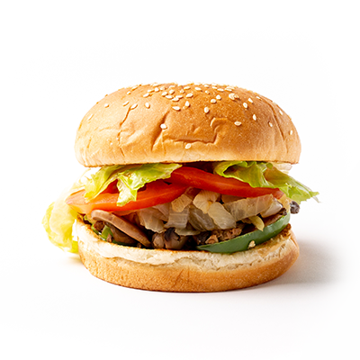 Freshly grilled onions, mushrooms and green peppers layered with lettuce and tomatoes on a soft, toasted sesame seed bun. Or start with the bun and build your own from scratch. Not a veggie burger.